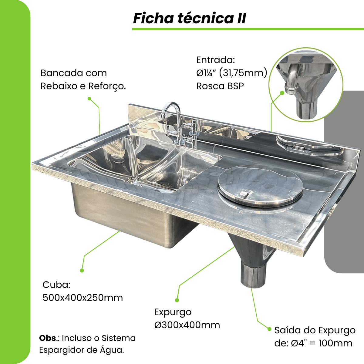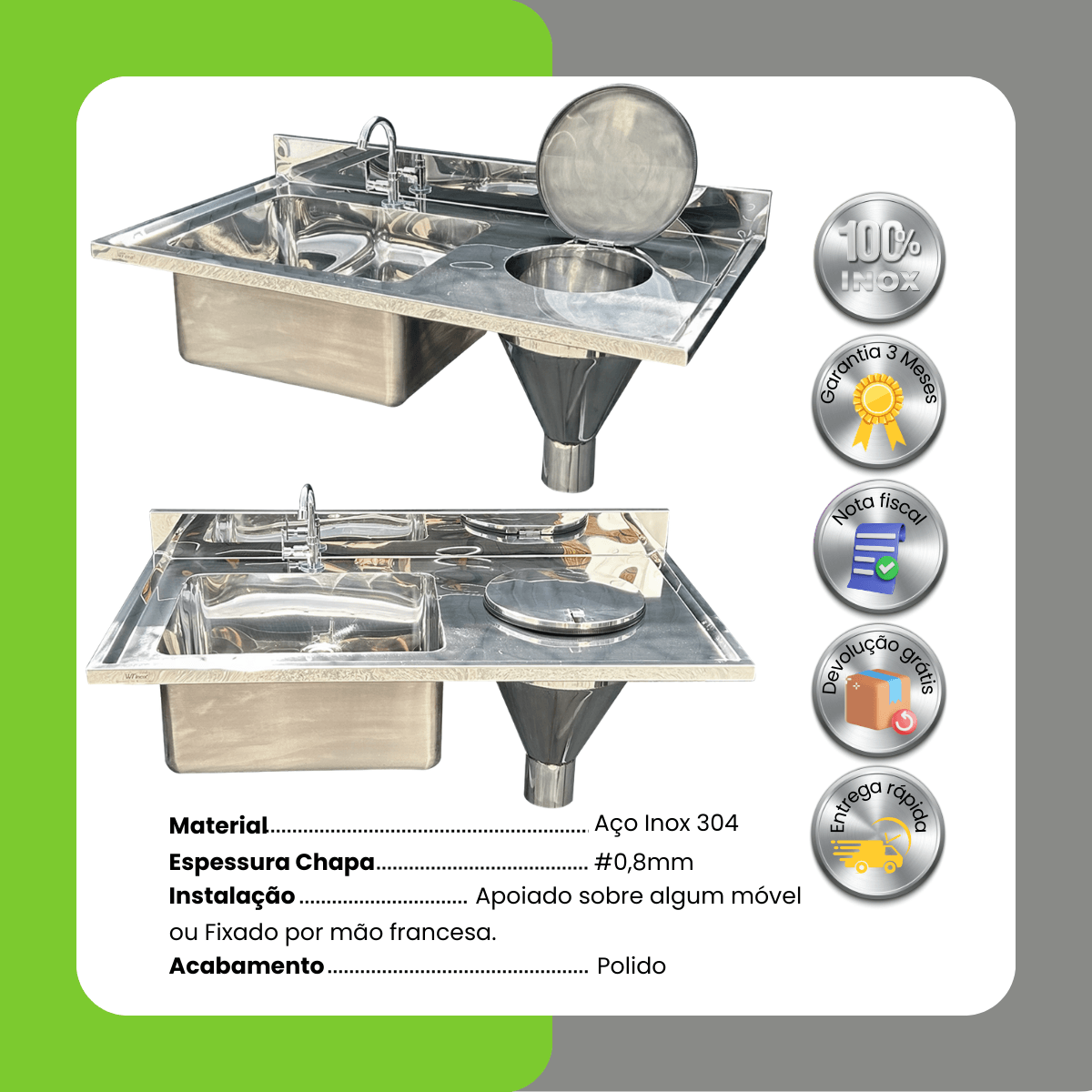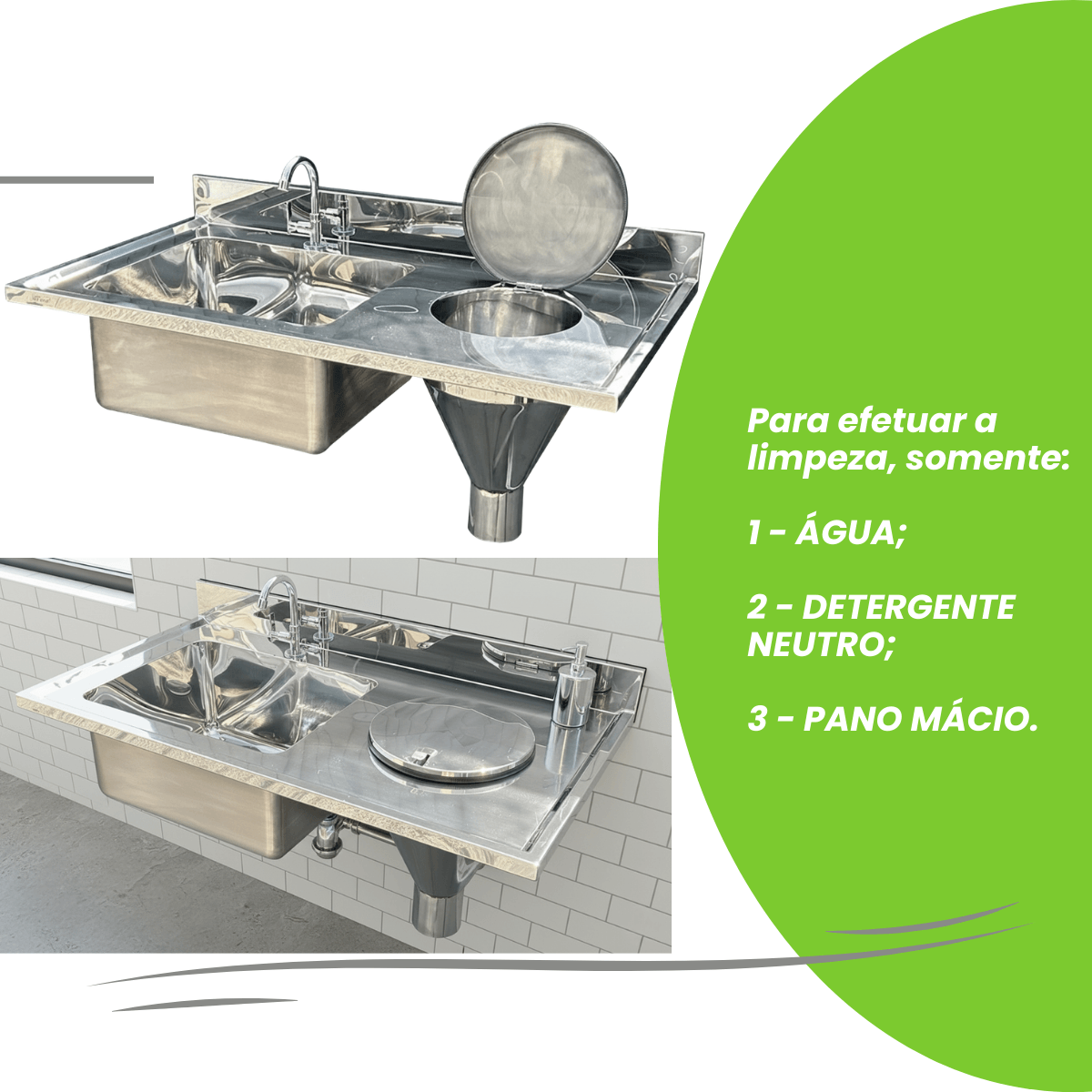 Fabricada em Aço Inox 304, oferece excelente resistência à corrosão, facilidade de limpeza e longa vida útil, características essenciais para locais que precisam manter controle rigoroso de higiene. O conjunto com cuba e expurgo torna o produto ainda mais funcional, contribuindo para uma rotina mais eficiente em espaços de atendimento, apoio e procedimentos.